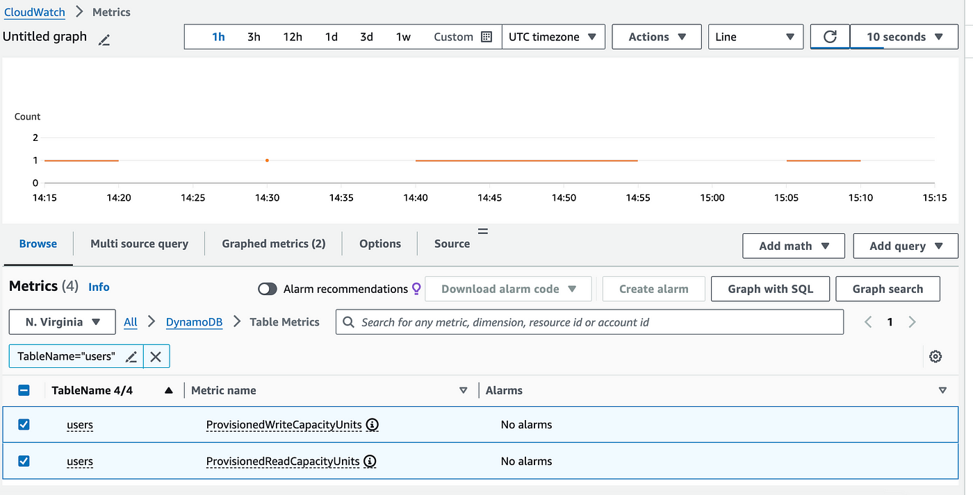 Here I’ve selected both ProvisionedReadCapacityUnits and ProvisionedWriteCapacityUnits to view their usage metrics: