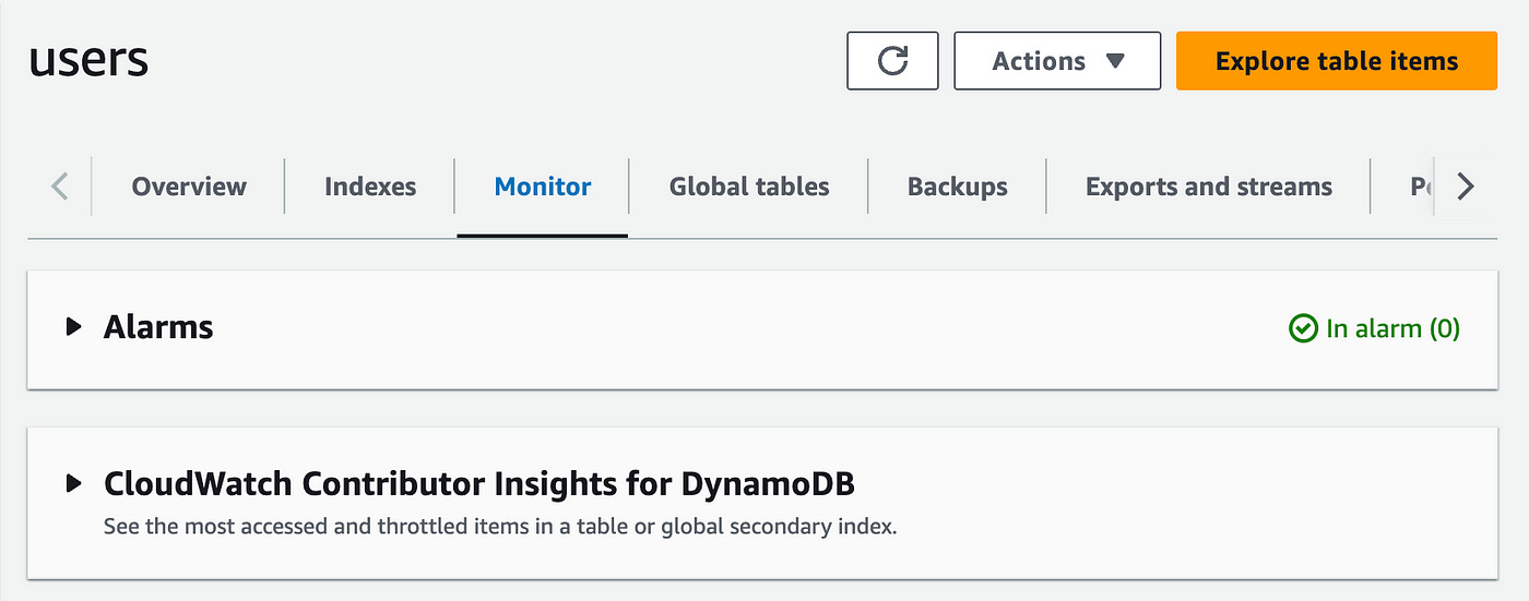 Head over to the Monitor section of your DynamoDB table to view the table’s metrics: