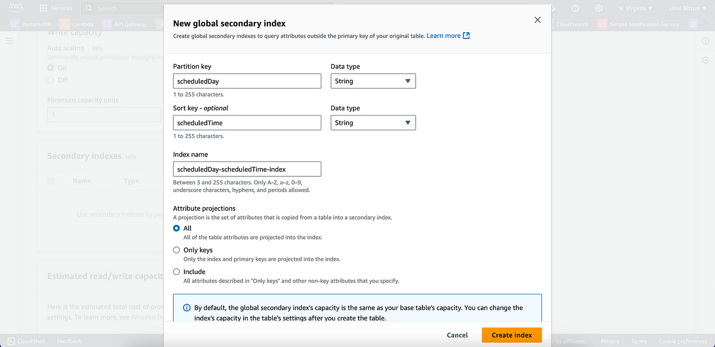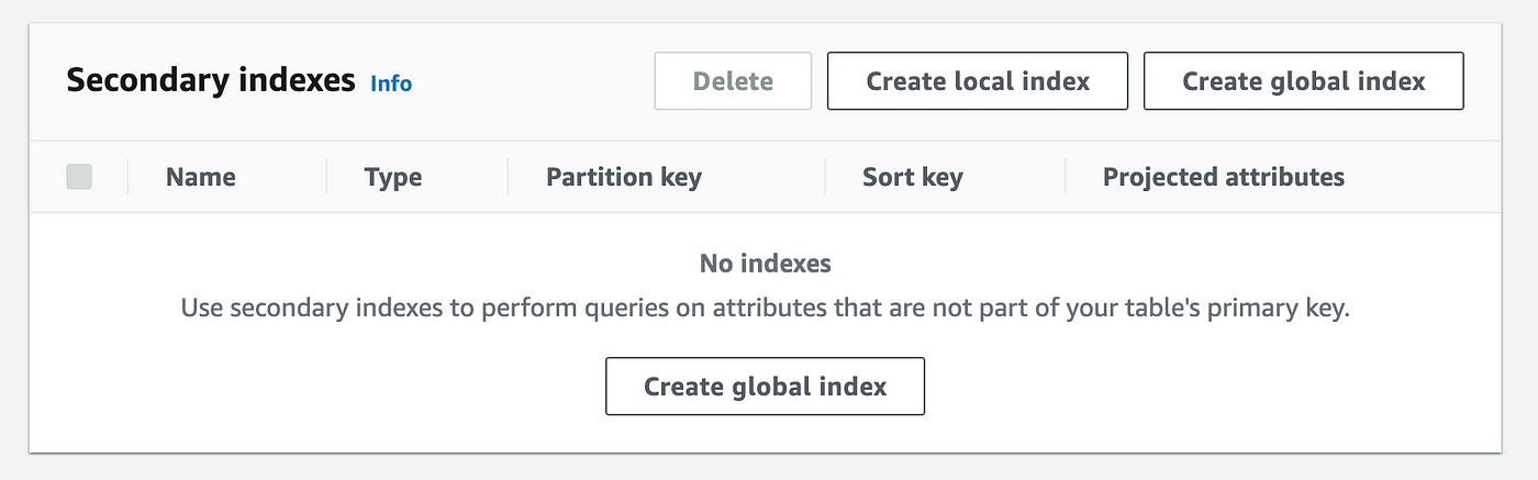 Then scroll down to the Secondary Indexes section and create a Global Secondary Index.
