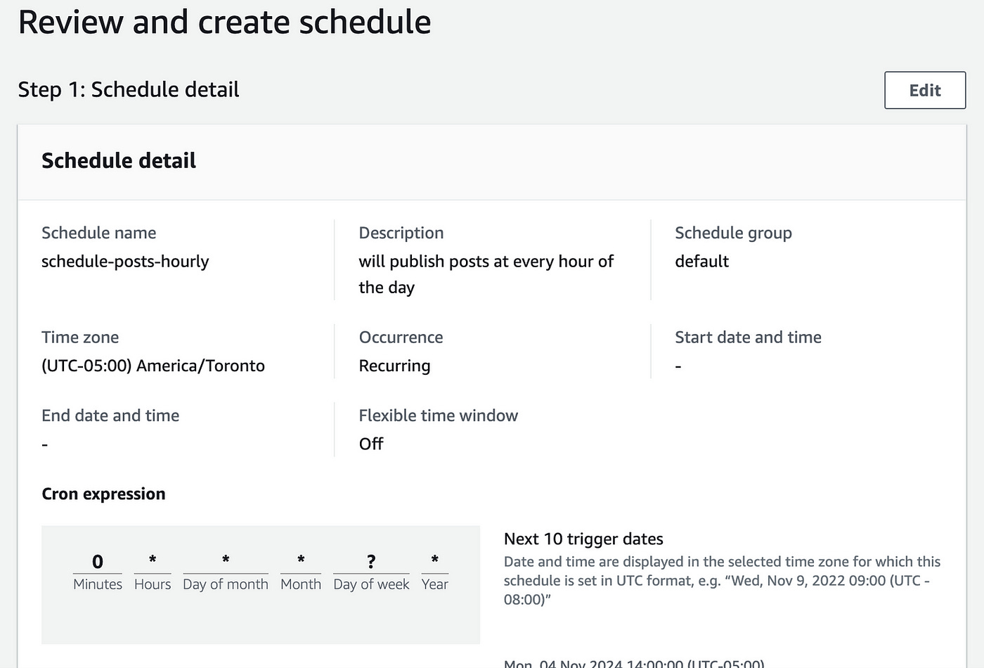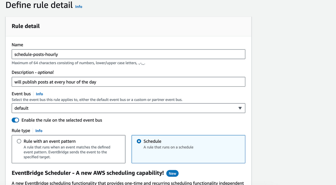 We can now wait for the EventBridge rule to trigger the Lambda function to schedule our post item. To accelerate the test you can choose a more frequent (5 minutes) schedule.