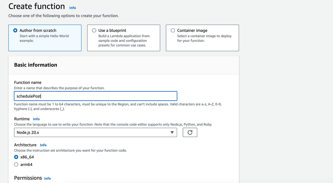 Create a new Lambda function. This time call it “publishPost” and use the same configurations as the first function.