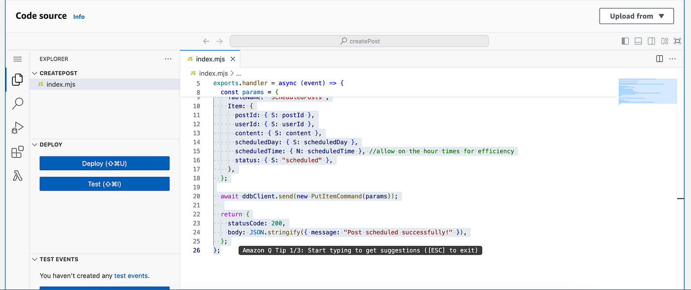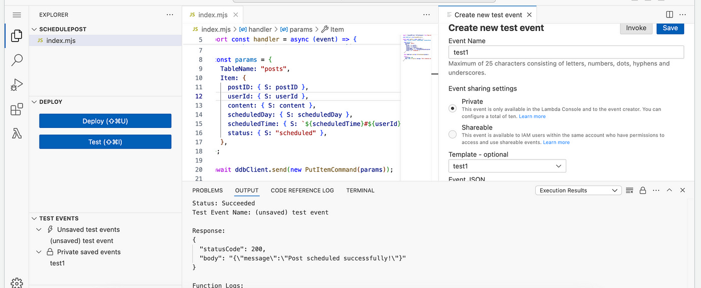 In Lambda, open the “schedulePost” function we created earlier and run a test with the following JSON payload: