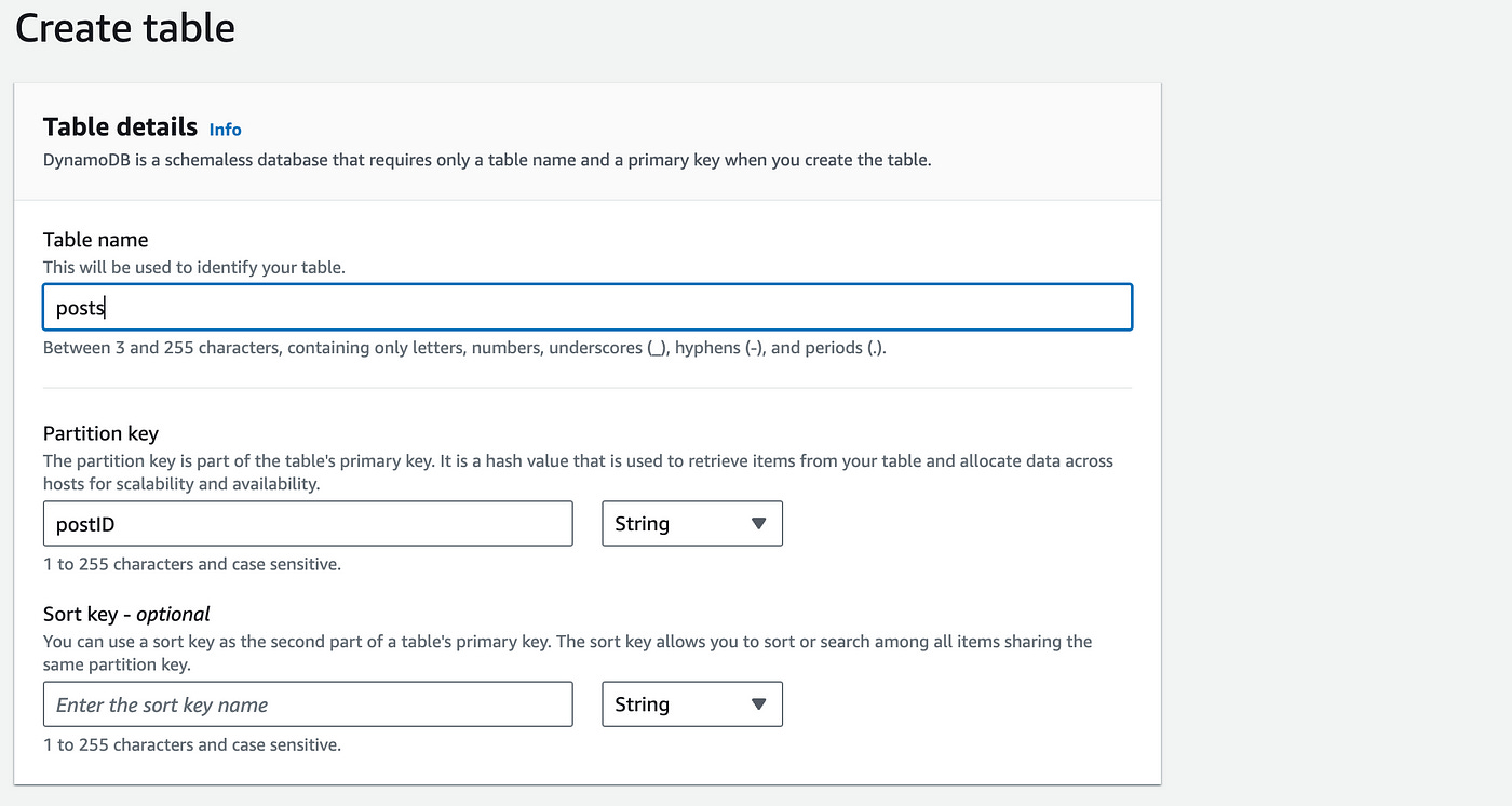 Name your table “posts” and use “postID” for the partition key (no need for a sort key).