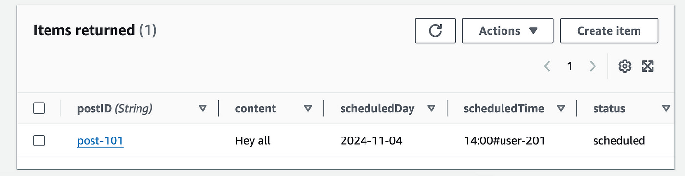 The “scheduleDay” partition key will store posts that are scheduled on a given day, and the sort key will allow us to filter posts by the time of the day a post is to be scheduled at.
