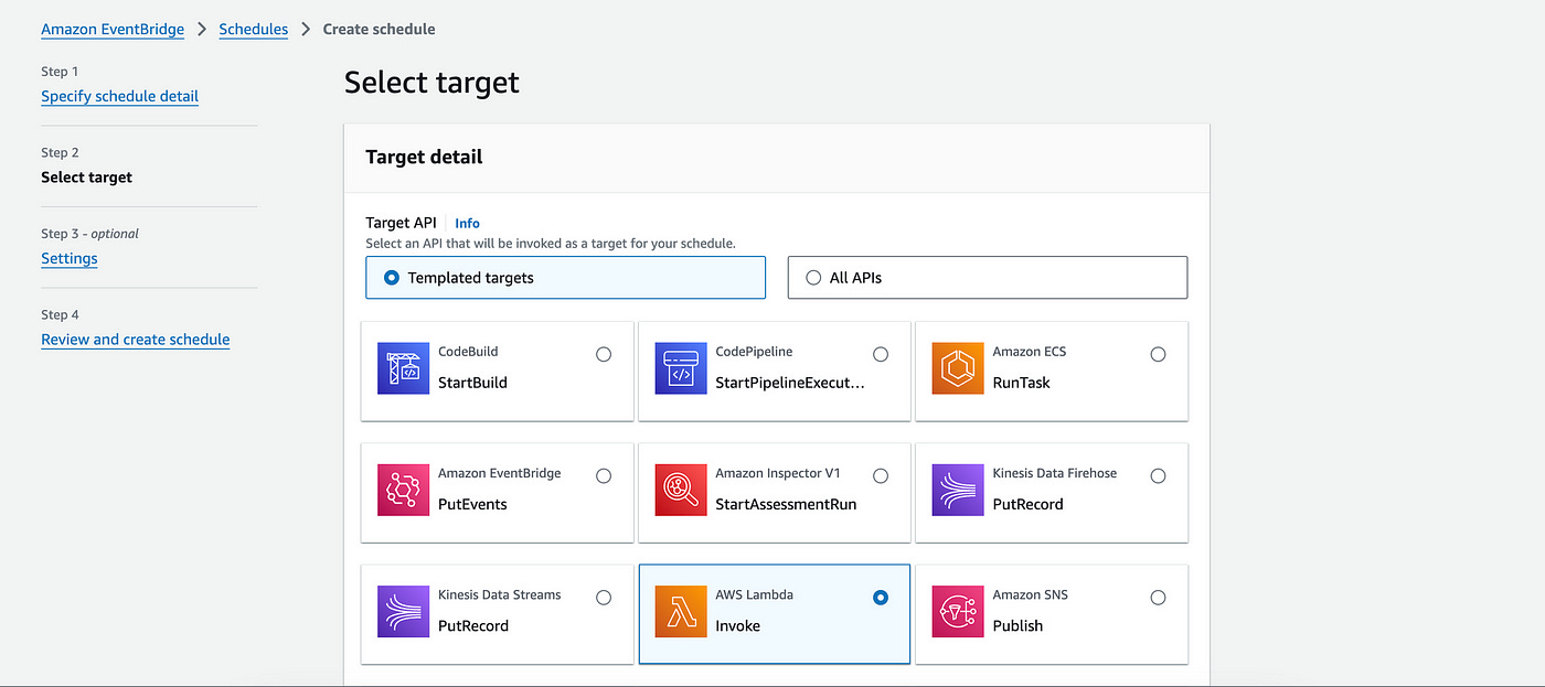 On the next page, we’ll select a target and choose the Lambda (invoke) option from the list.