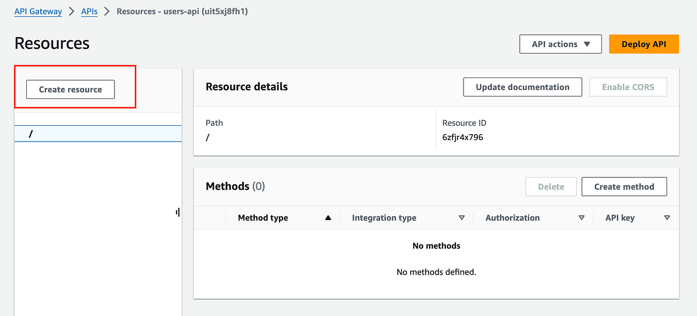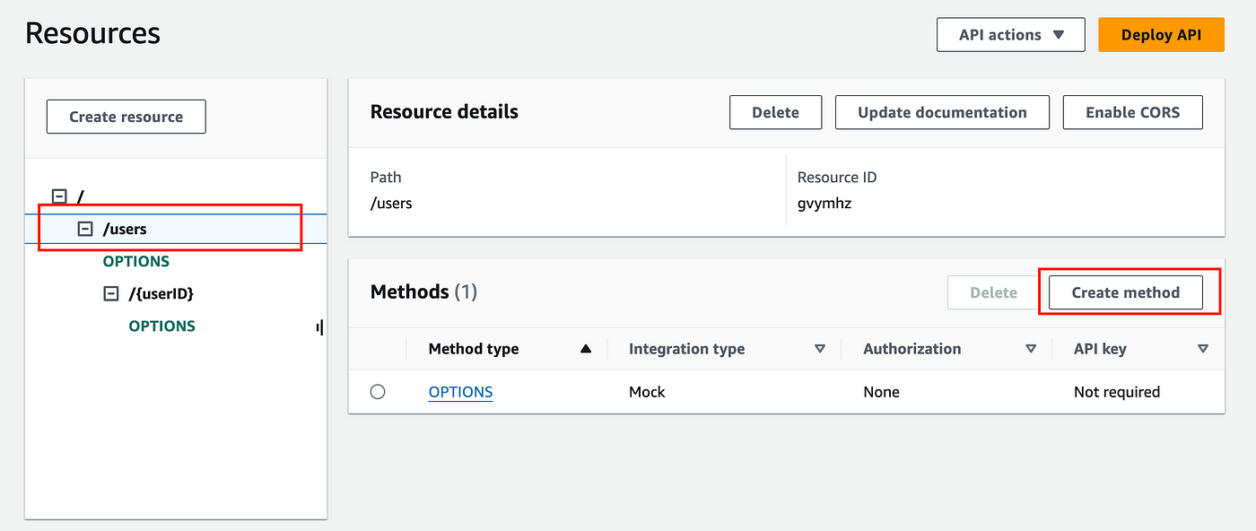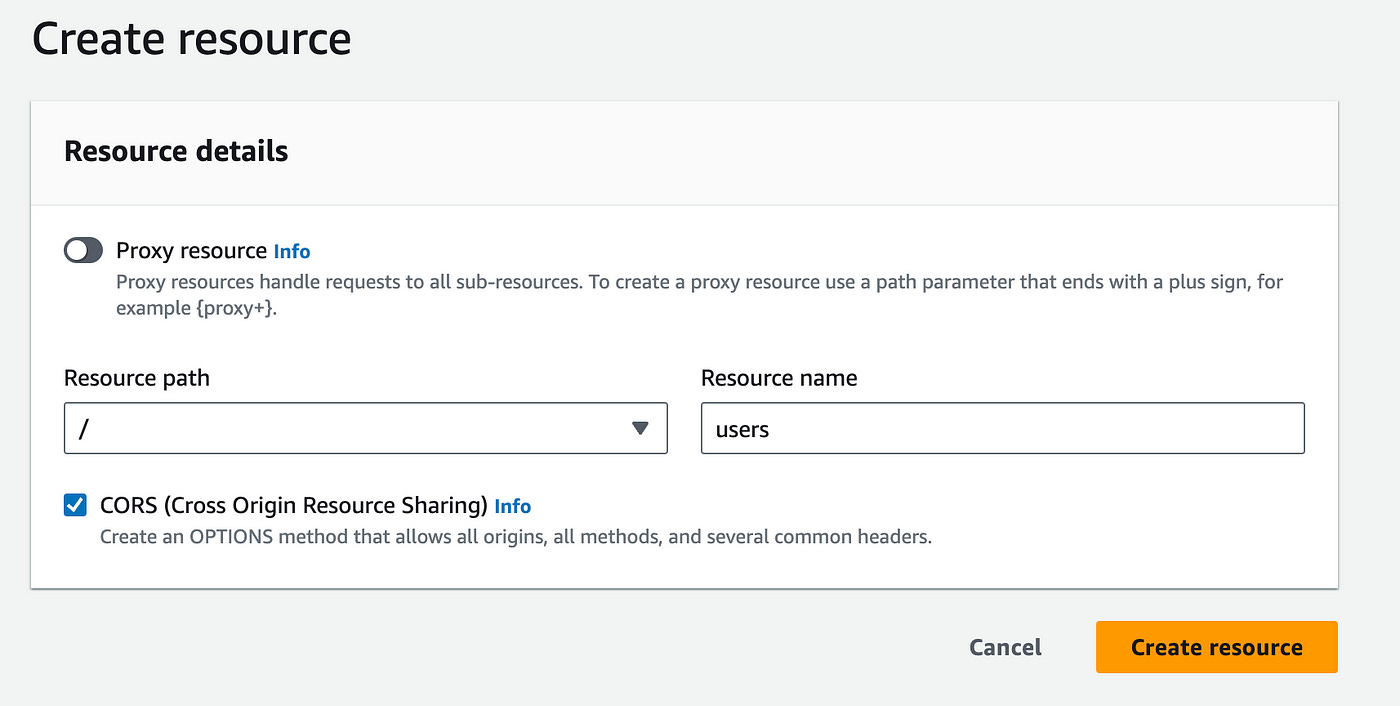 On this page add a resource name under the root (/) path, add “users” for the resource name and check the CORS option.