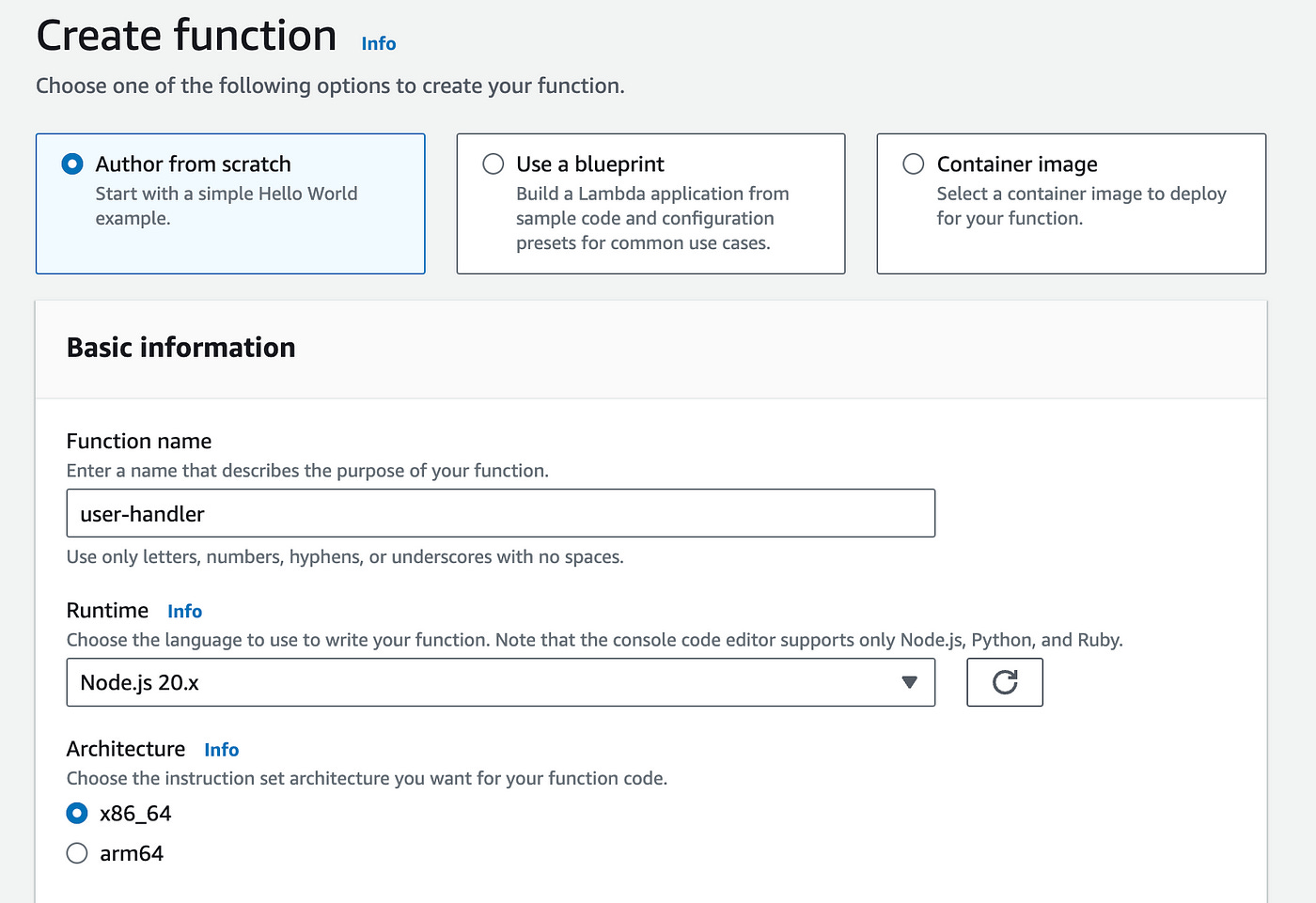 Choose the Node JS 20.x runtime