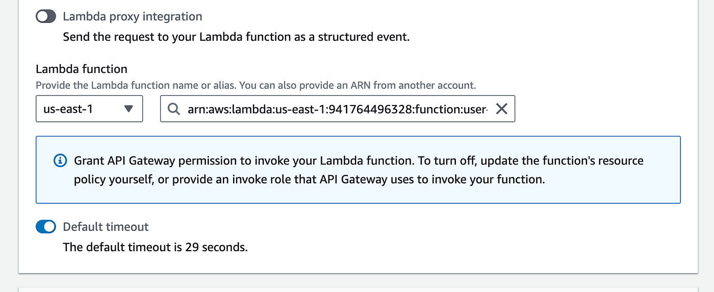 Under permissions: create a new role in IAM with AmazonAPIGatewayInvokeFullAccess permissions to the function (Here’s an easy guide on how to do this).