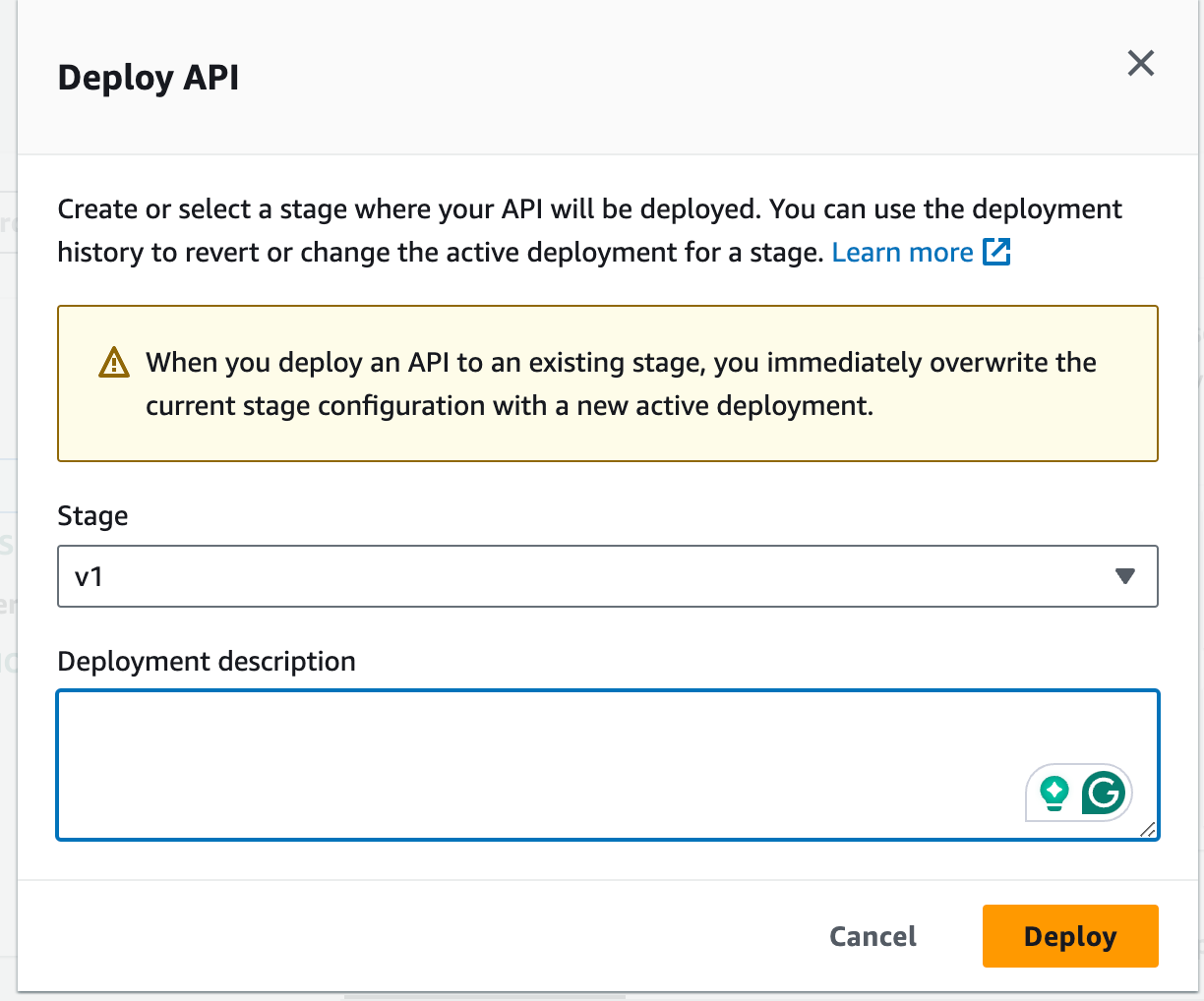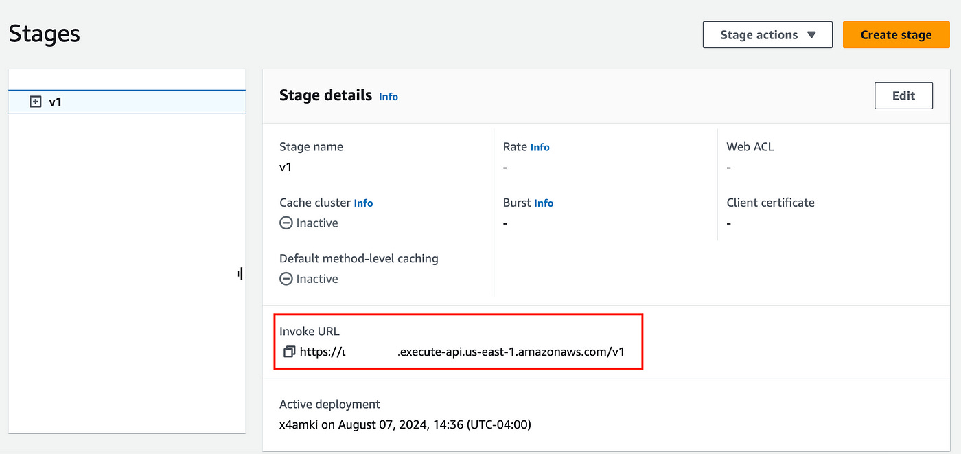 Enter a stage name “v1” and hit Deploy.