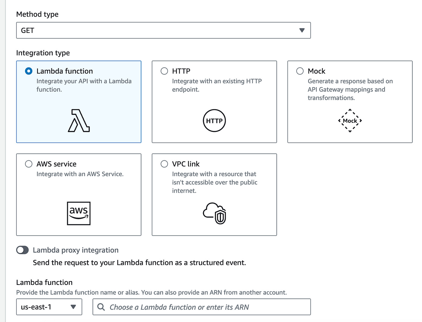 Here you can select GET as the Method type and choose the Lambda function integration option.