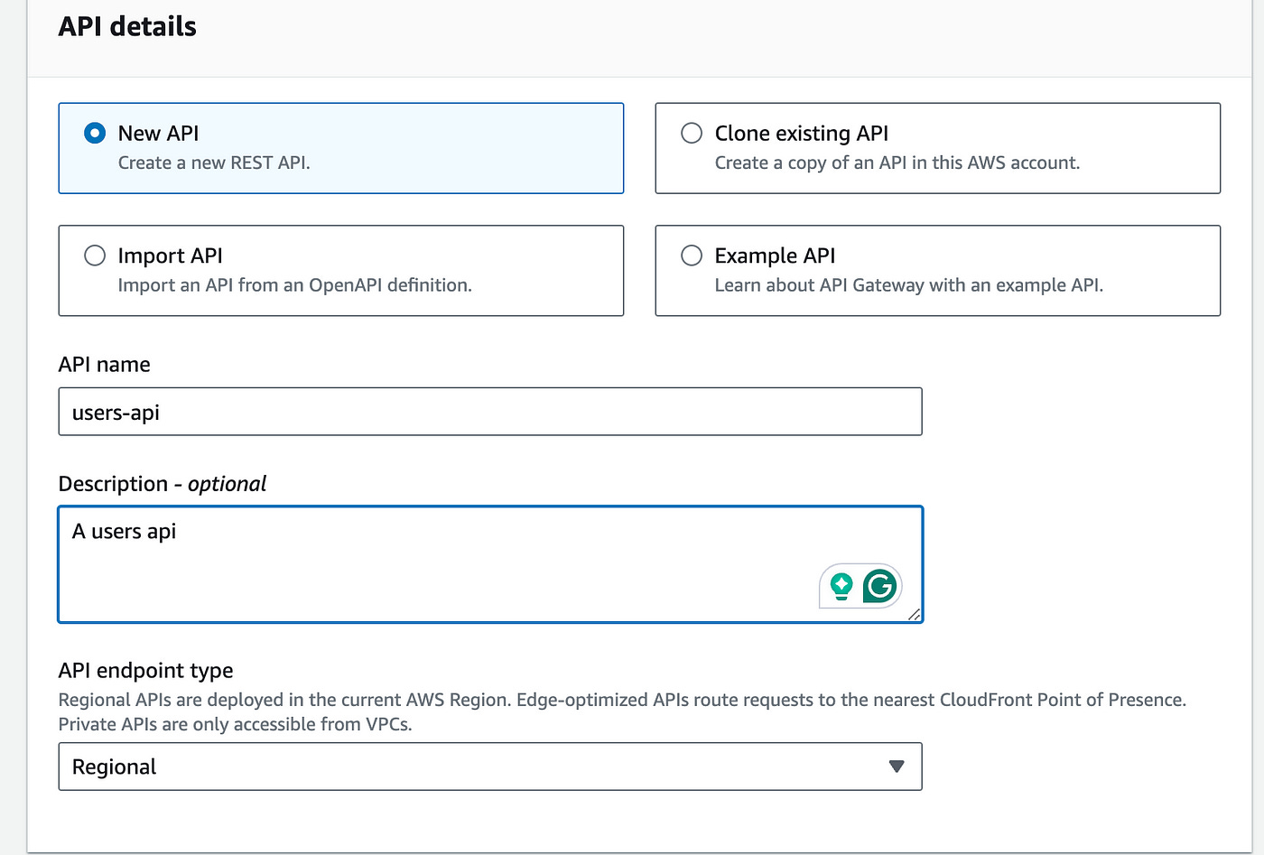 Choose New API, name it “users-api”, add a description, and choose Regional for the API endpoint type.