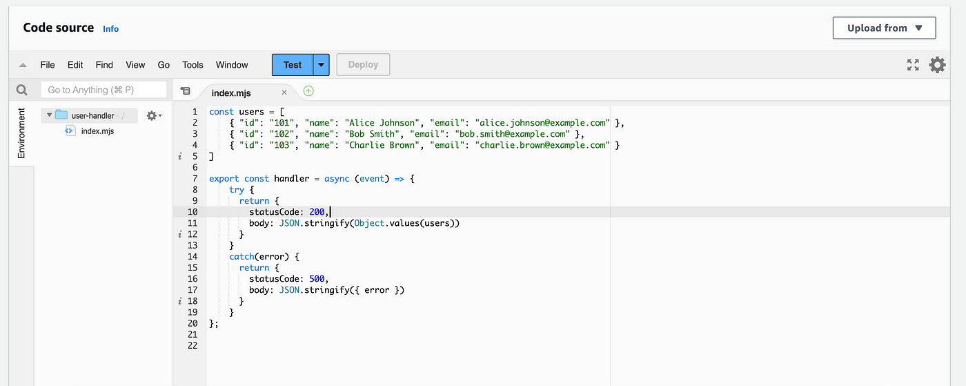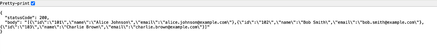 https://xyz.execute-api.us-east-1.amazonaws.com/v1/usersWhen you enter this URL, you should see the following output: