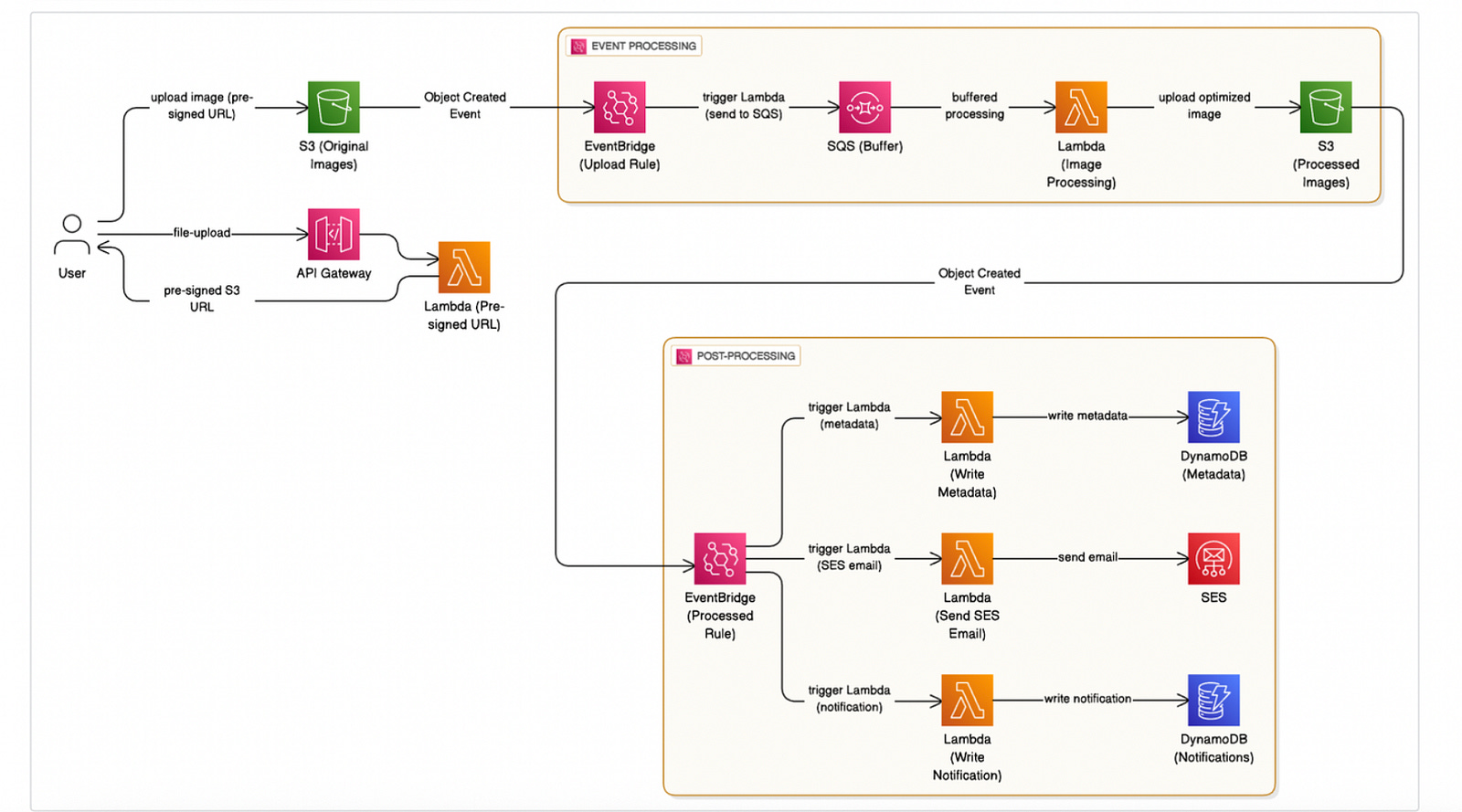 Adding this Eventbridge layer adds flexibility to our architecture. If new downstream services are needed in the future (e.g. call an AI API to analyze images), we simply create a new EventBridge rule without touching the existing Lambdas.