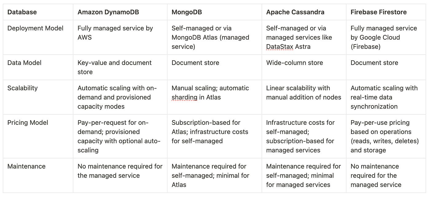 Apache Cassandra: Good fit for high write throughput applications but involves higher infrastructure costs and maintenance.