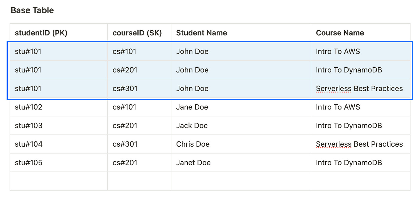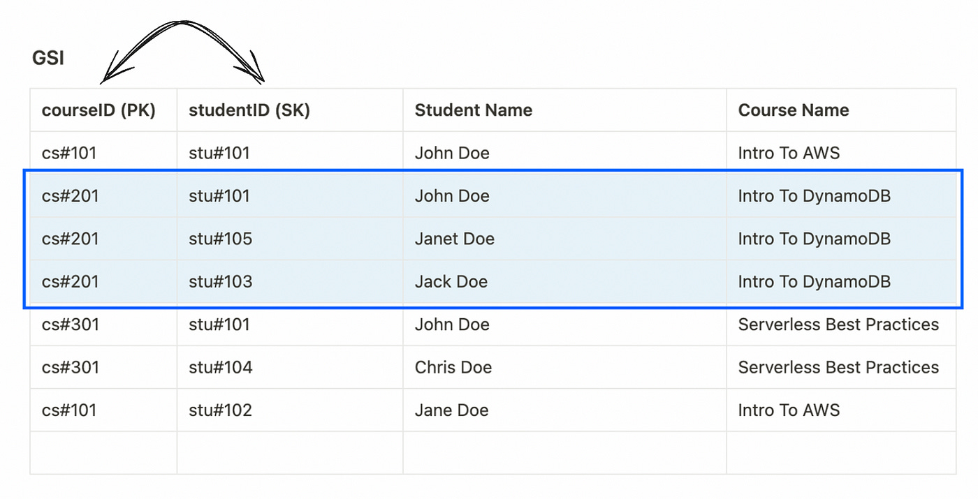 KeyConditionExpression: "#courseID = 'cs#201' AND begins_with(#studentID, 'stu#')