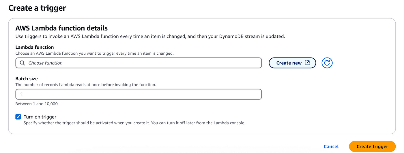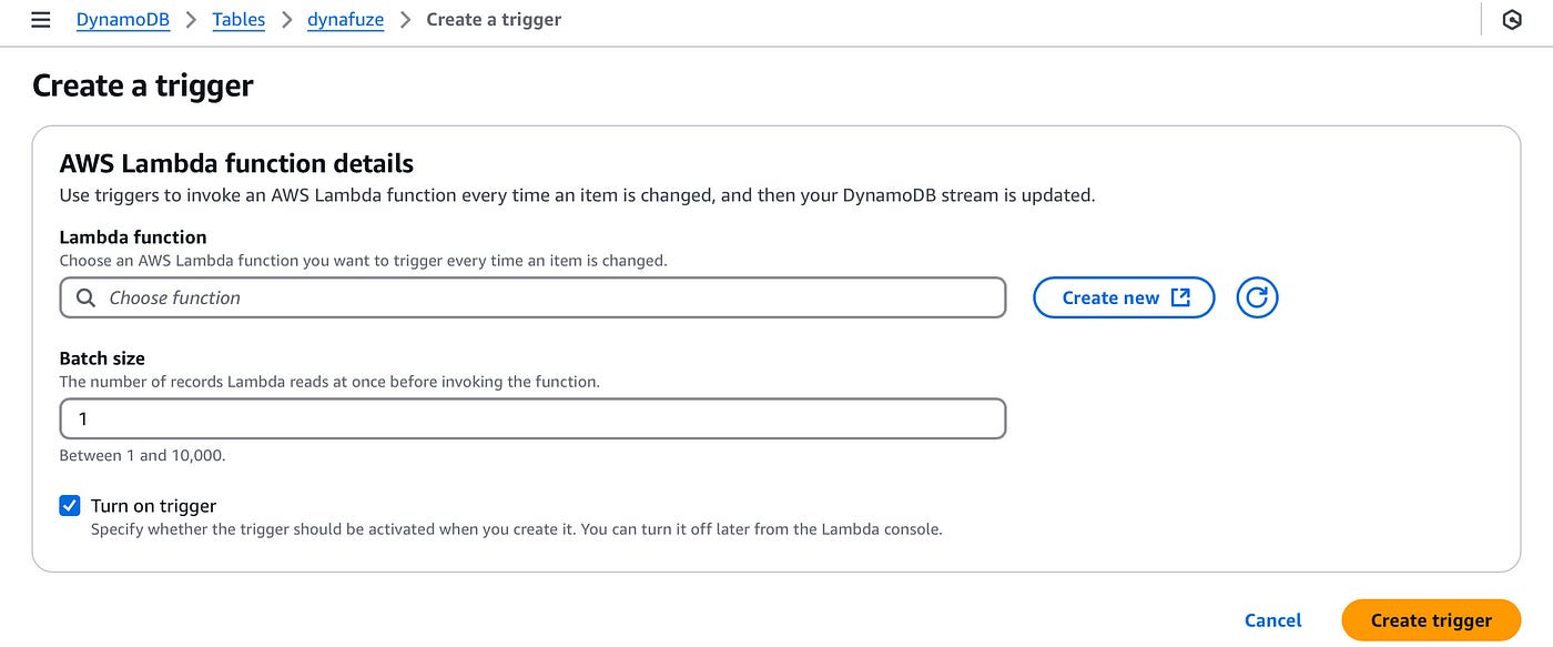 In the Lambda function input, find and add the new function we just created. You can now click on Create trigger to add the trigger.