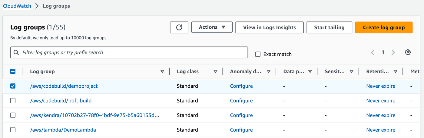 On this new page you will see a list of all the log groups that have automatically been created for you by AWS for various services.