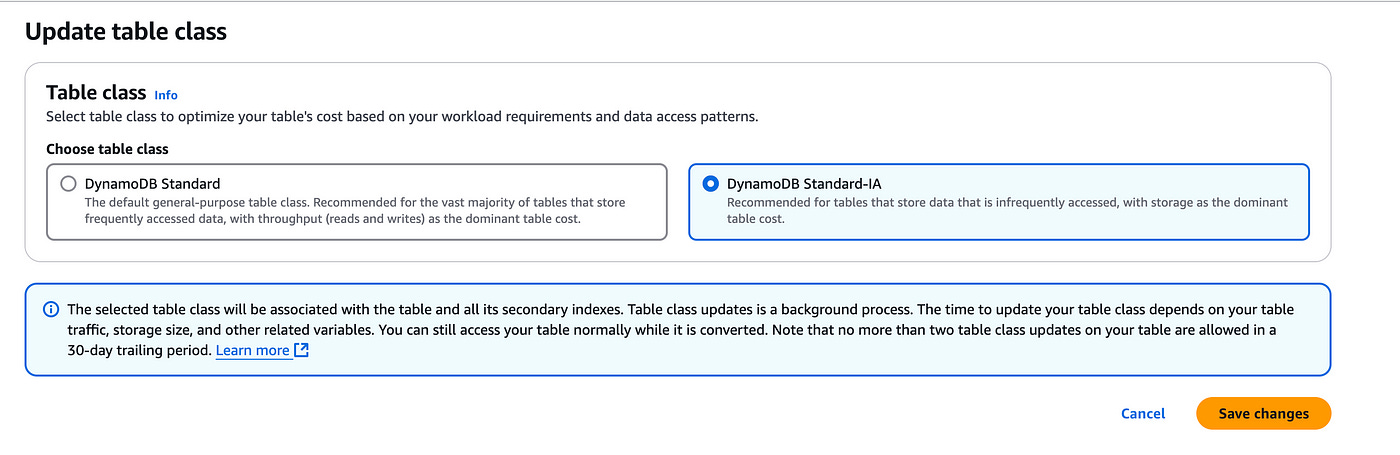An IA DynamoDB table class can help you reduce your storage costs by up to 60% compared to the standard table.