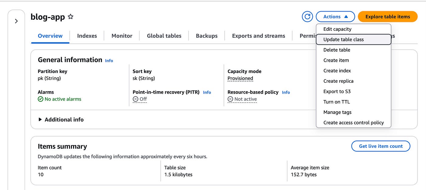 To change your table class to IA, in the table page, in the overview section, click the Actions button, and select Update table class.