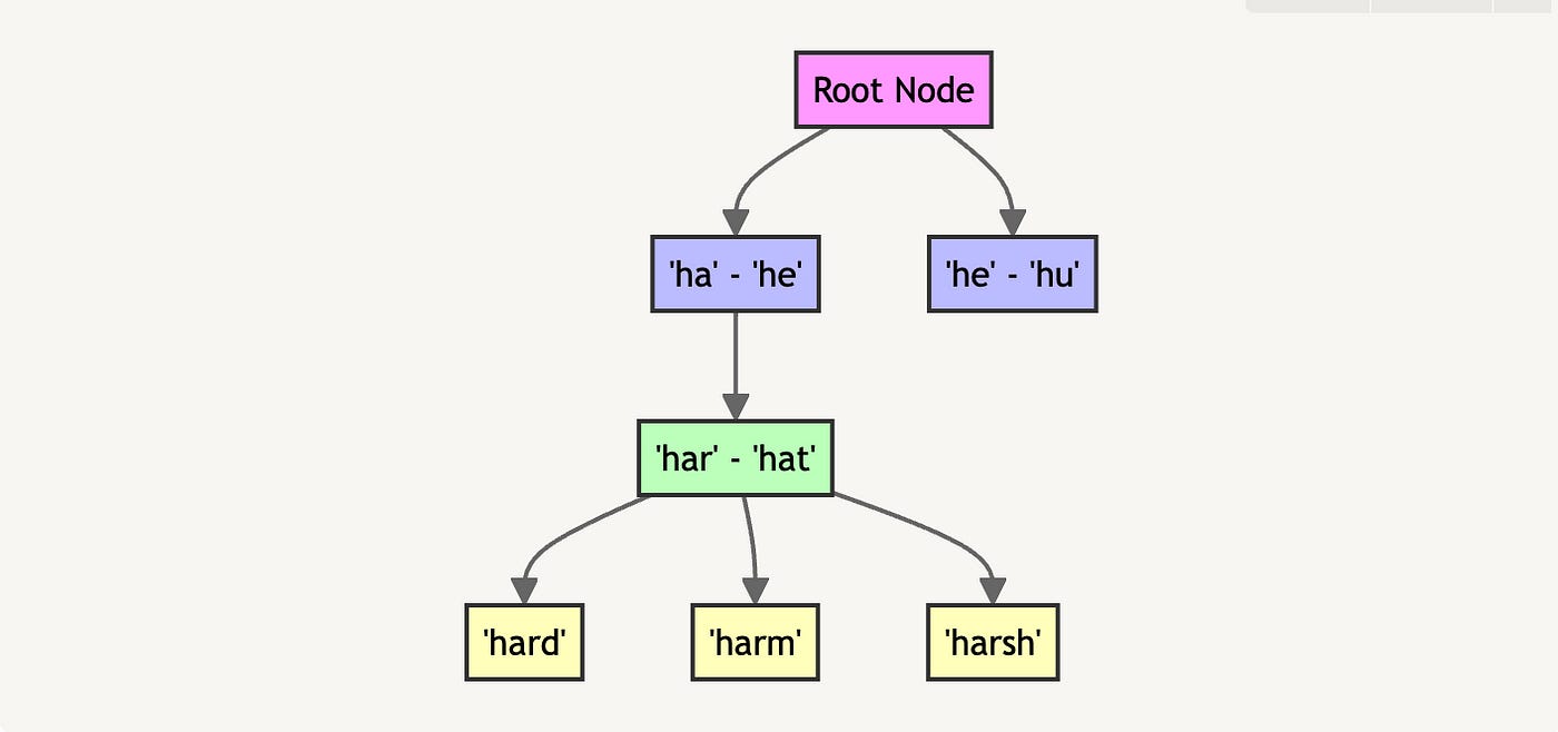 For example, “ha” will be at the top of the structure, followed by “har”, then “hard”, “harm” and “harsh”. After all “ha…” items have been stored, items that start with “he…” will be stored (refer to screenshot above).