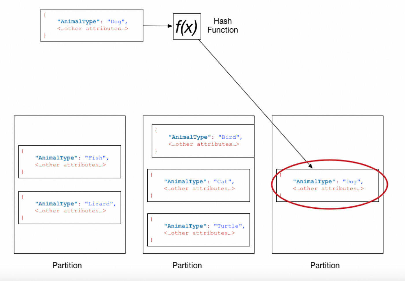 Your data is distributed across partitions, with the item’s partition key dictating the partition (using a hash function) where that item will be stored.